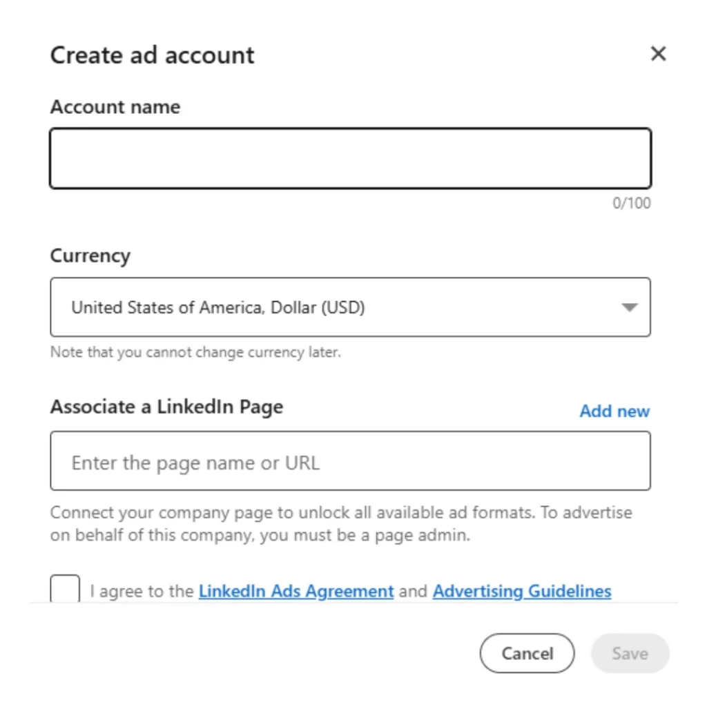 Connect your advertising account to your already established Company Page. This feature enables your advertisements to display under your company’s official name and uphold your brand identity.Currency: